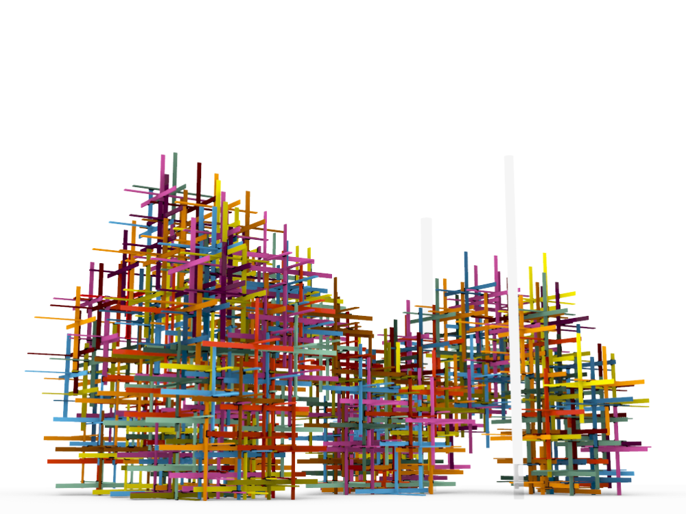 Aus einer amorphen Form des Künstlers wird eine Punktewolke erstellt, in welcher die Elemente durch den Algorithmus nach bestimmten Parametern positioniert werden.