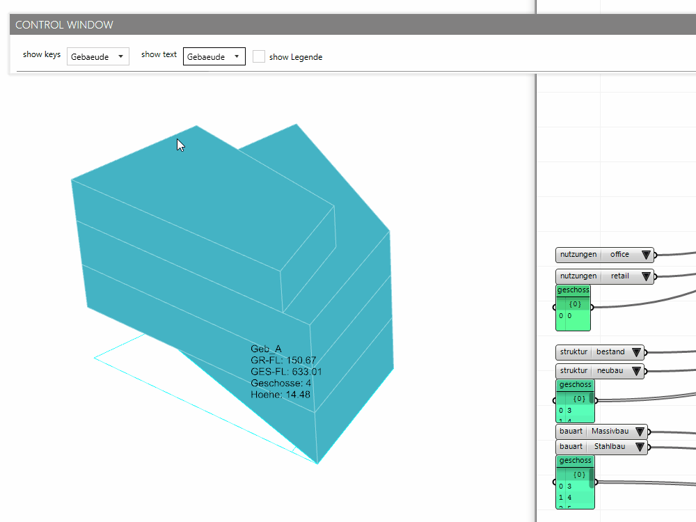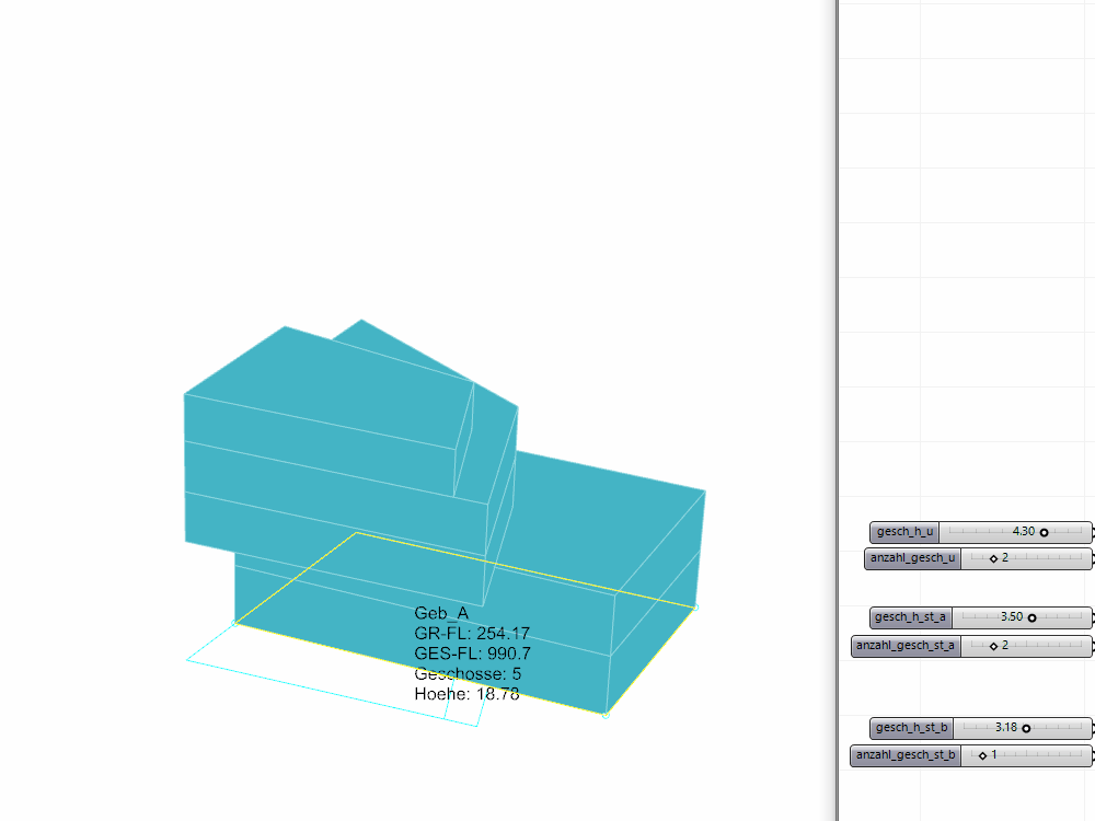 Parametrische Definition und einfache Anpassung der Geometrie Gebäudes: - Grundfläche über Linie - Geschosse über Linie - Höhen der Geschosse - Anzahl der Geschosse