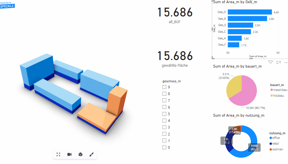Interaktives, frei gestaltbares Dashboard, in Power-Bi. Visualisierung der Daten in 3d und in charts. Das Modell kann nach Filtern/Parametern live untersucht und diese Informationen gezielt dargestellt werden.